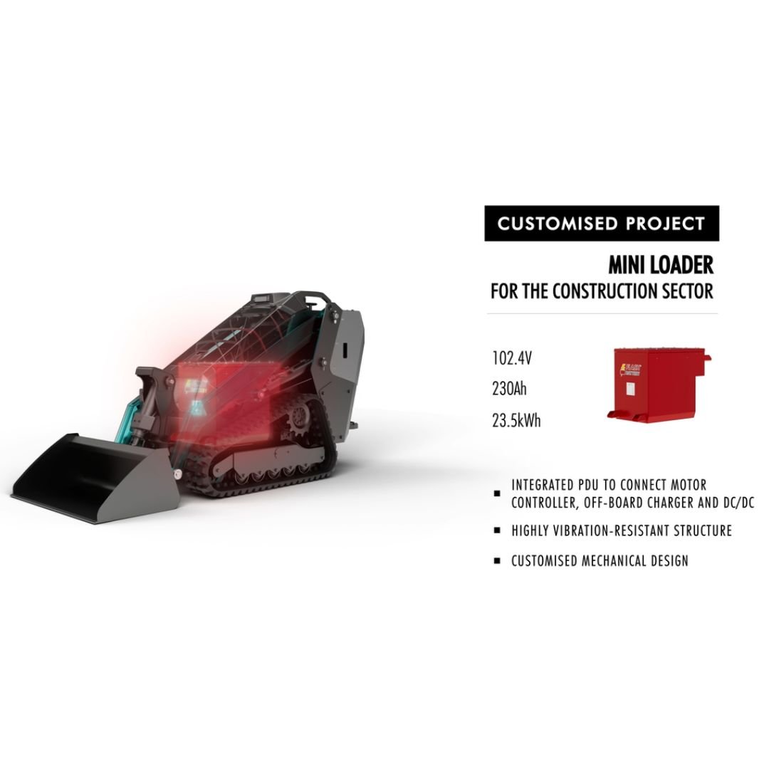Genau dieser Herausforderung hat sich unser Lithiumbatterie-Partner Flash Battery gestellt und eine maßgeschneiderte 102,4 V – 230 Ah – 23,5 kWh Lithiumbatterie für einen vollelektrischen Minilader entwickelt.